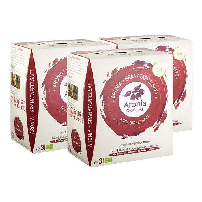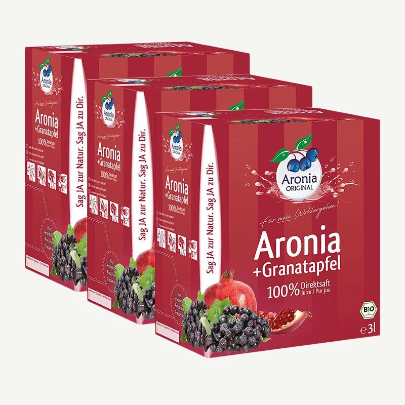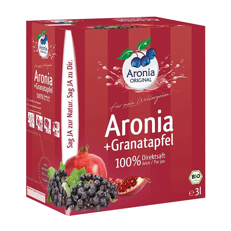 Aronia Original Bio Aronia plus grenade 100% pur jus : mélange de jus de fruit à base d’aronia et de grenade en paquet pratique pour un mois sur nu3 !