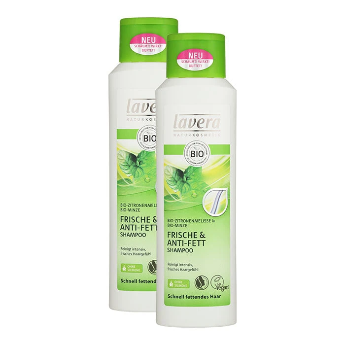 Lavera, Frais et anti-cheveux gras : un shampoing doux aux extraits naturels de menthe et de citron qui laisse une sensation de fraicheur !