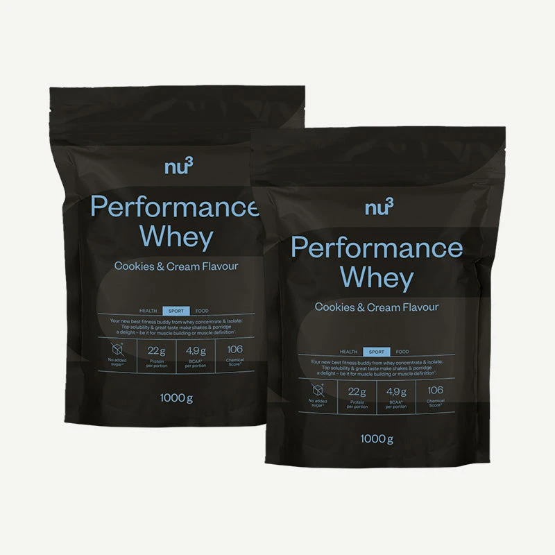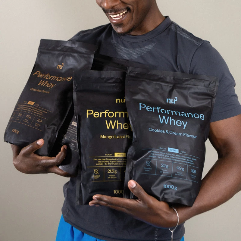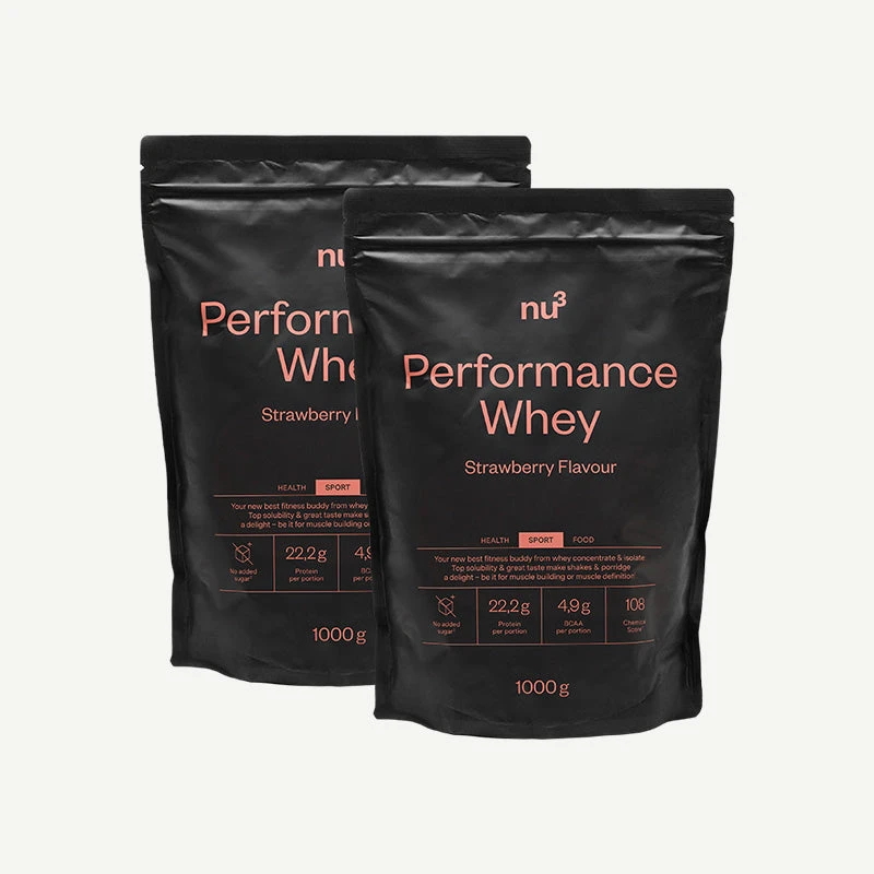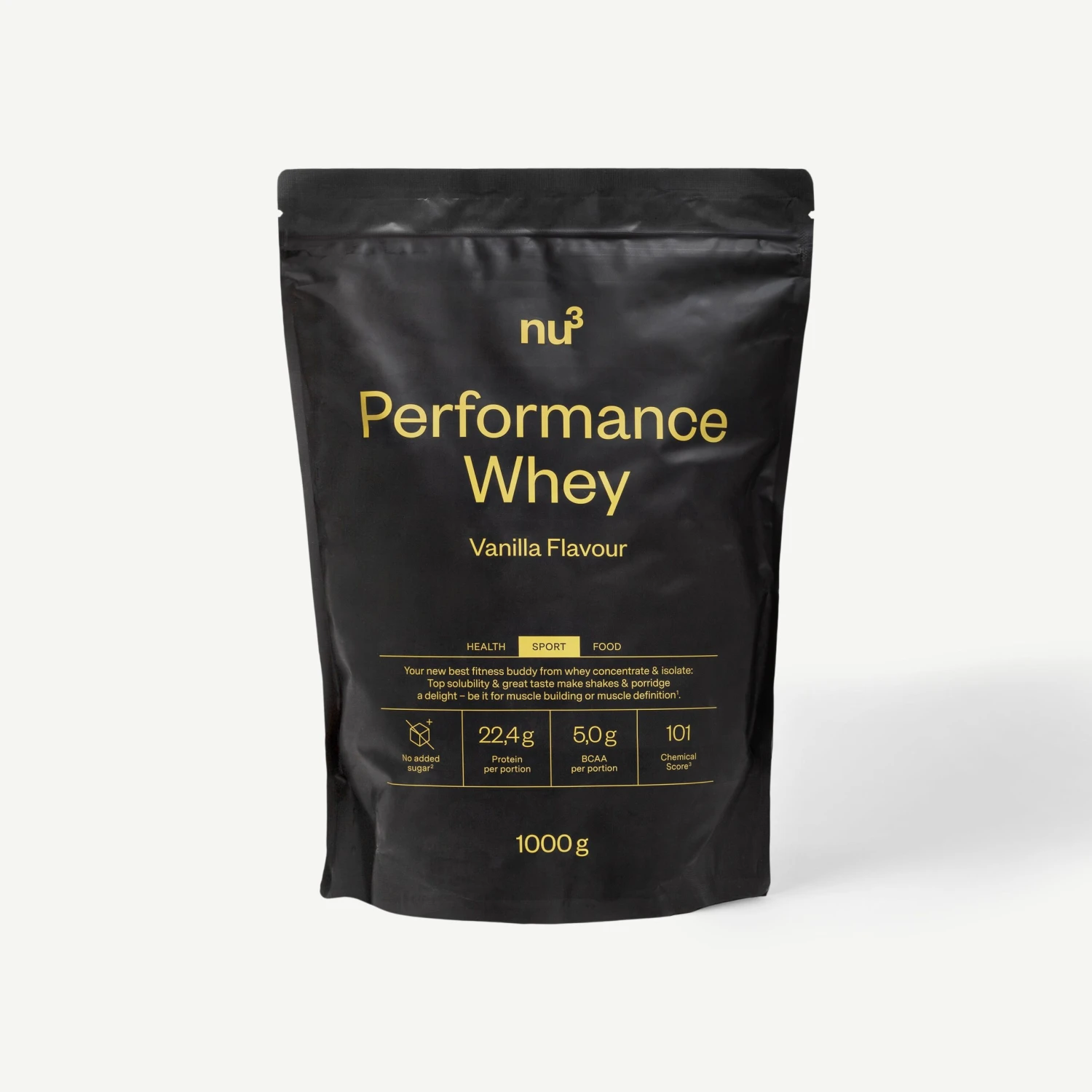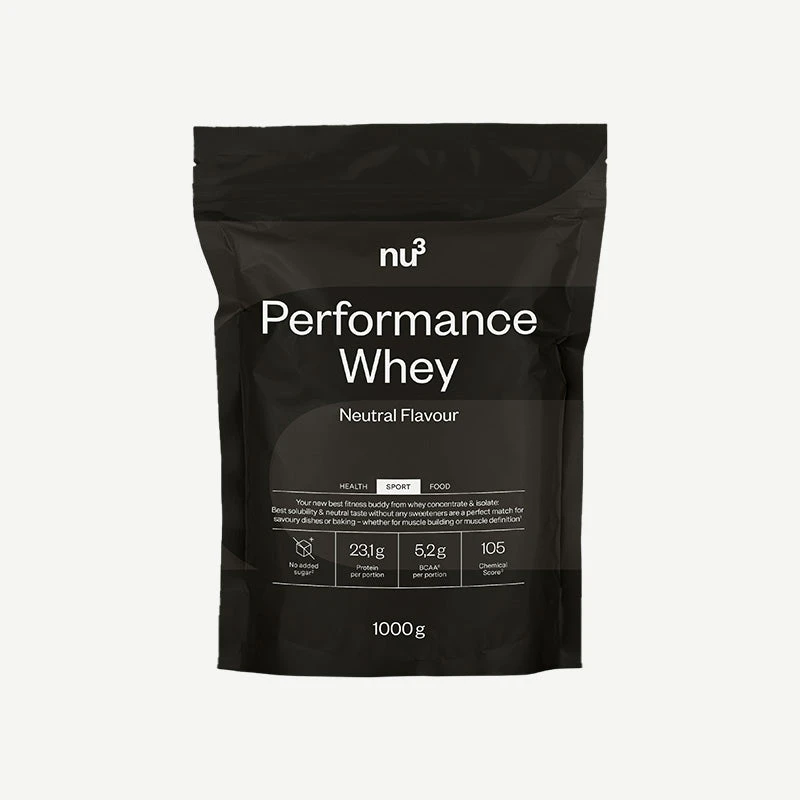 nu3 Whey Performance protéine en poudre : plus de 22 g de protéines par portion, différentes saveurs et parfaite solubilité.