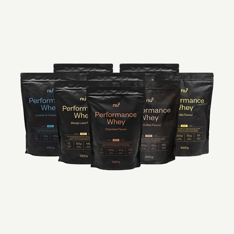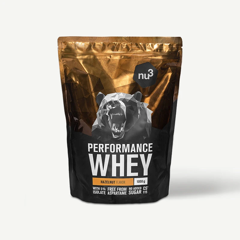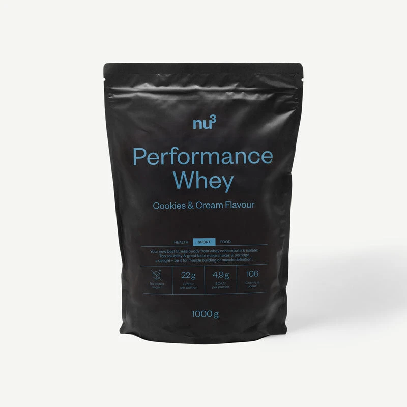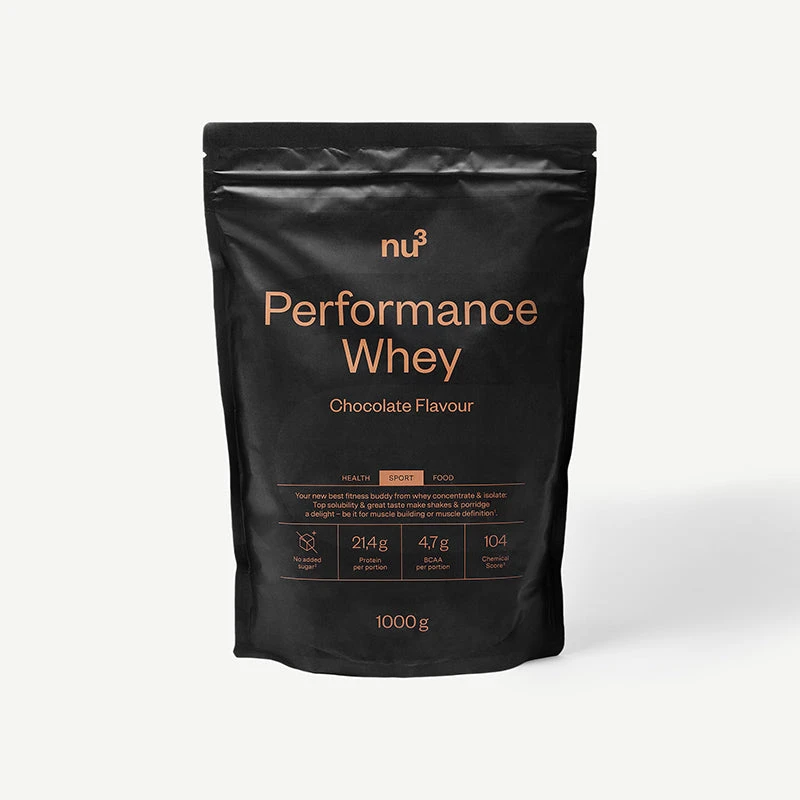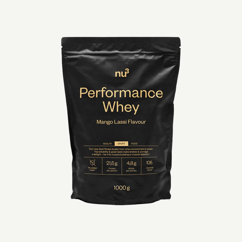 nu3 Whey Performance protéine en poudre : plus de 22 g de protéines par portion, différentes saveurs et parfaite solubilité.