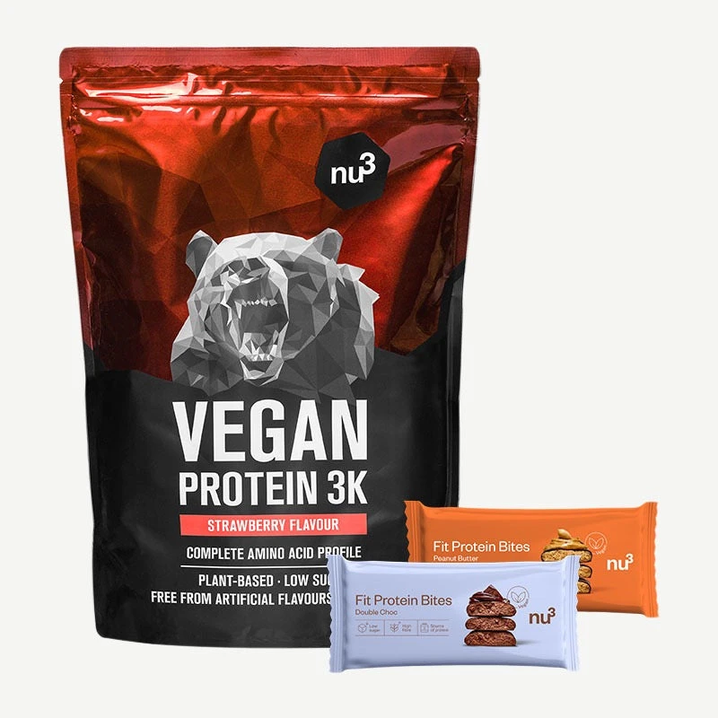 Pack nu3 Vegan Protein : poudre de protéines vegan plus bouchées protéinées à tester gratuitement – sans soja & sucre ajouté. Acheter chez nu3 !