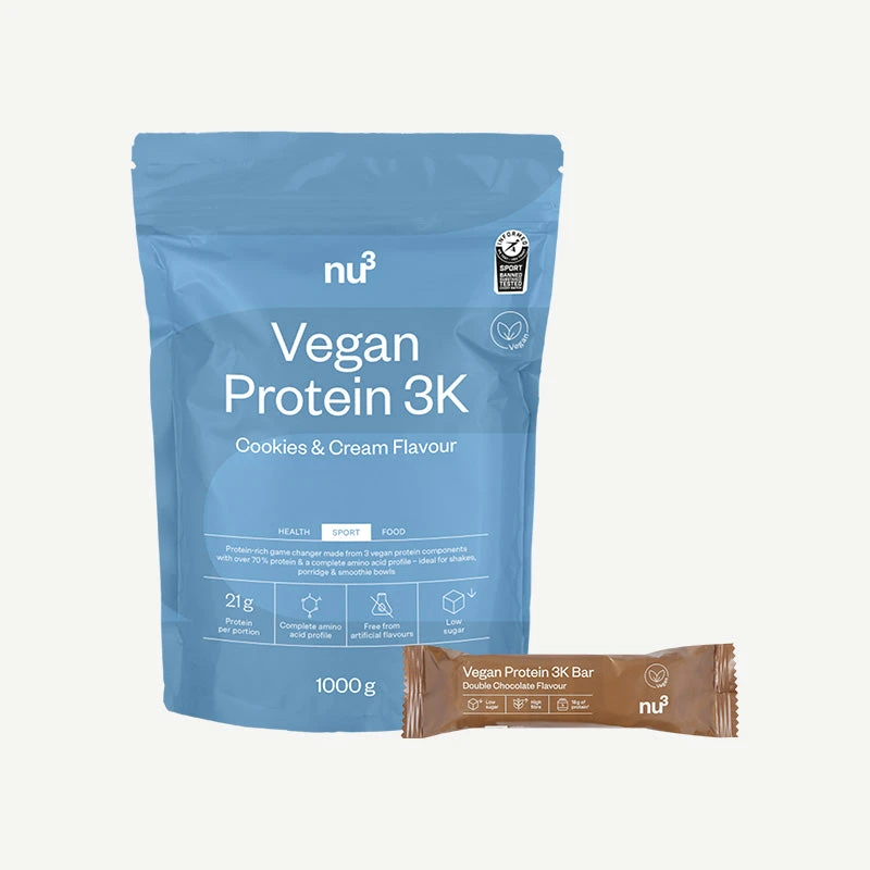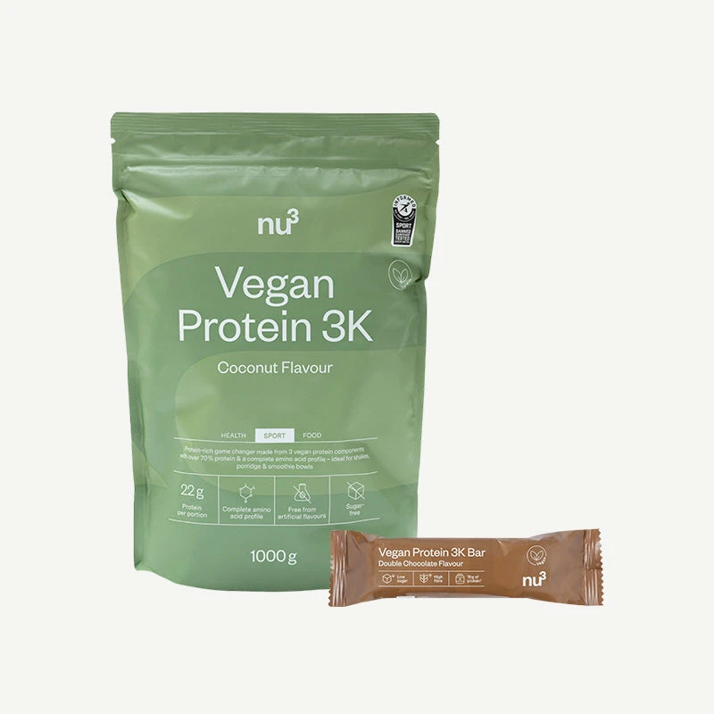 Pack nu3 Vegan Protein 3K : poudre de protéines vegan plus barre vegan – sans soja ni sucre ajouté. Achetez chez nu3 !